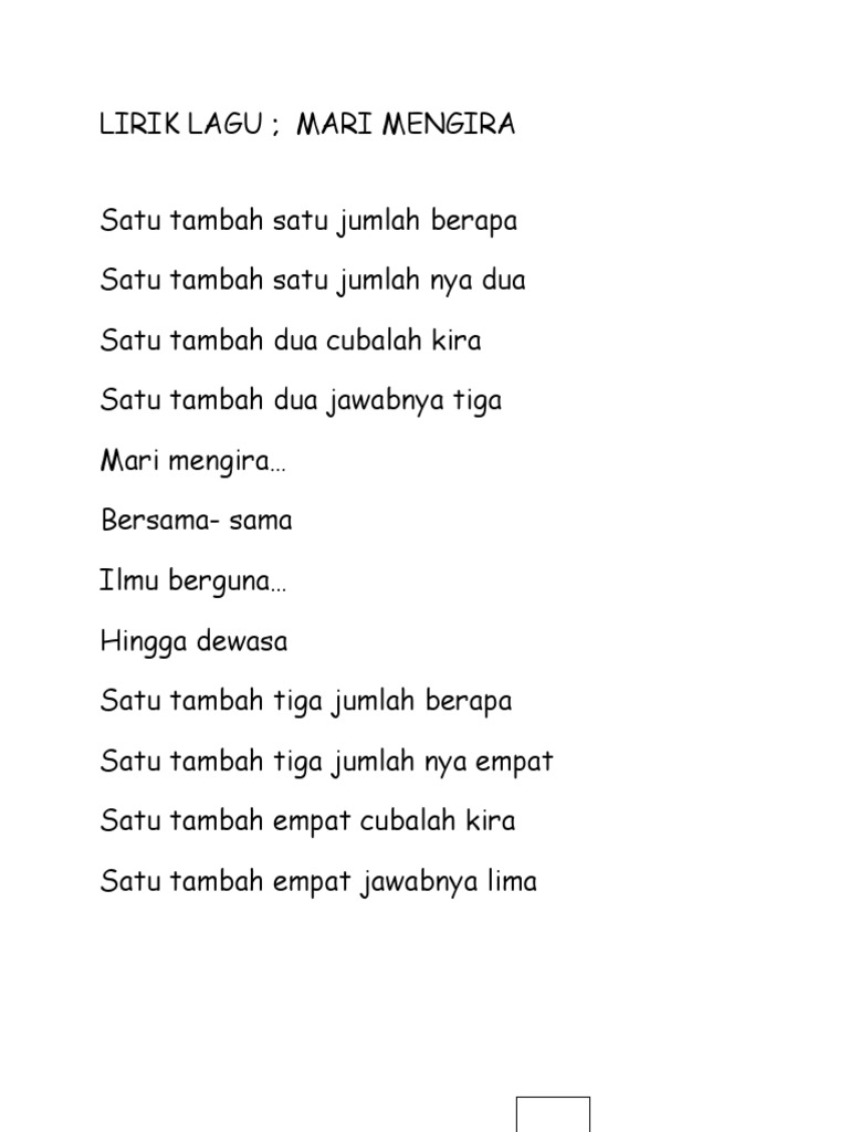 Satu tambah tiga. Kita cakap kita bisik Mari mengira bersama-sama Lelaki dan perempuan Ilmu berguna hingga dewasa. Berikut cuplikan syair nyanyian teks dari lagunya.